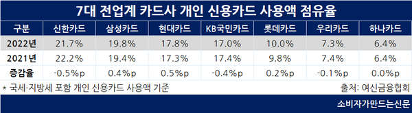 점유율 기준으로는 신한카드가 21.7%를 기록하며 1위를 지켰지만 전년 대비 0.5%포인트 하락했다.