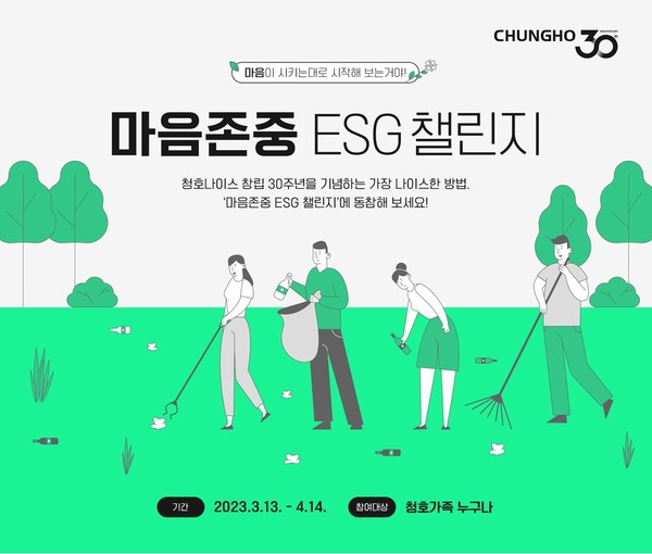 '마음존중 ESG 캠페인'은 청호나이스 임직원들이 자발적으로 환경보호 실천을 할 수 있도록 3가지 미션(▲플로깅 ▲제로웨이스트 ▲워킹챌린지)이 제공되며 일상 속에서 자유롭게 실천 후 별도 제작된 캠페인 사이트를 통해 인증하는 활동이다.
