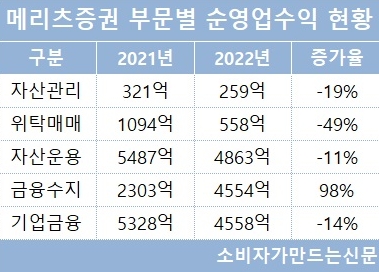 지난해 메리츠증권은 증권사 중 유일하게 영업이익 '1조클럽'을 달성했는데 IB와 금융수지 등의 사업이 실적을 견인했기 때문이다. 실제로 위탁매매(Brokerage) 수익 비중은 전체 순영업수익의 3%, 자산관리 수익 비중도 1.4%에 불과했다.