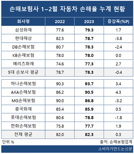 한화손해보험과 롯데손해보험, 흥국화재, 하나손해보험, MG손해보험, AXA손해보험 등 중소형 손보사까지 합산할 경우 손해율은 82.3%로 전년 대비 0.3%포인트 소폭 상승했다.