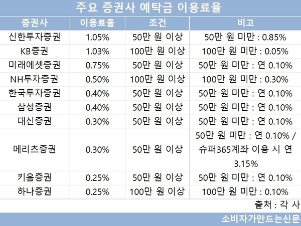 자산규모 기준 상위 10대 증권사 가운데 신한투자증권이 예탁금 이용료율 1.05%로 가장 높았고, 하나·키움증권이 0.25%로 가장 낮았다.