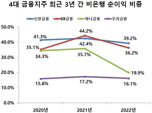 우리금융지주는 지난 2019년 재출범을 하고 올해 5년 차에 접어들었지만 보험 및 증권 계열사가 없어 타 금융지주에 비해 은행 의존도가 월등히 높다. 지배구조상 지주사 체제를 갖췄지만 은행 이익 의존도가 절대적이다.