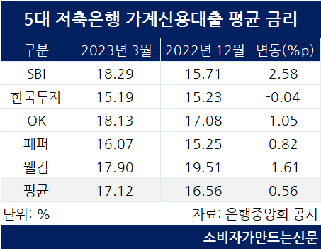 29일 저축은행중앙회 공시에 따르면 5대 대형 저축은행의 가계신용대출 평균금리는 17.12%로 지난해 12월 기준 16.56%보다 0.56%포인트 상승했다.