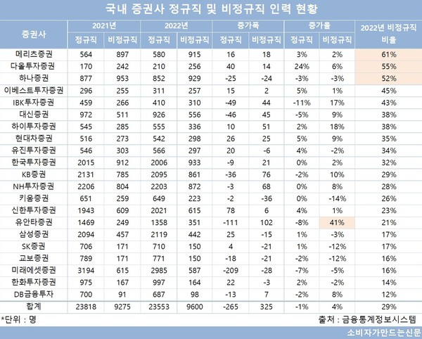 지난해 비정규직 증가율이 가장 높았던 곳은 유안타증권으로 2021년 249명에서 2022년 351명으로 41%(102명) 늘었다. 반면 이 기간 정규직은 1469명에서 1358명으로 8%(111명) 감소했다.