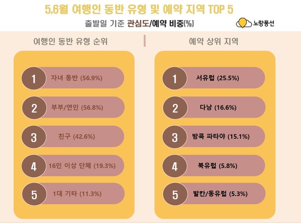 노랑풍선에 따르면 5~6월 여행인 동반 유형은 자녀 동반이 56.9%로 가장 높은 비중을 차지했으며 부부·연인이 56.8%로 그 뒤를 이었다. 전체 지역 중 예약률이 가장 높은 곳은 서유럽(25.5%)으로 다낭(16.6%)과 방콕 파타야(15.1%), 북유럽(5.8%), 발칸·동유럽(5.3%) 등 기존 인기 여행지들이 순위권을 차지했다. 올해는 코로나19의 완화로 개방한 항공 노선이 늘어나 지난해 동기간 대비 예약율도 15~20% 높아졌다.
