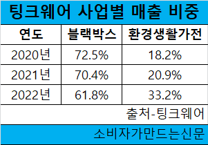 반면 생활가전·환경가전 제품 등을 판매하는 환경생활가전 사업부문의 비중은 2021년 20.9%에서 2022년 33.2%로 12.3%포인트 높아졌다. 2021년까지는 해당 사업부문이 '기타'로 분류됐으나 지난해에는 '환경생활가전'으로 바뀌었다.