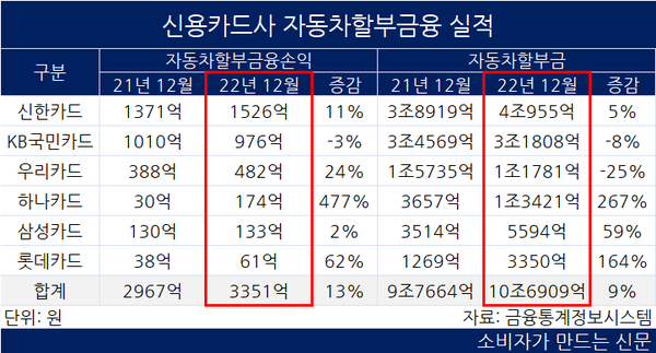 자동차 할부금융을 통해 카드사들이 얻은 수익도 13%늘었다. 6개 카드사들은 지난해 자동차 할부금융을 통해 3351억 원을 벌어들였다. 이 가운데 신한카드가 11% 늘어난 1526억 원으로 가장 많았고, KB국민카드가 976억 원, 우리카드 482억 원으로 뒤를 이었다.