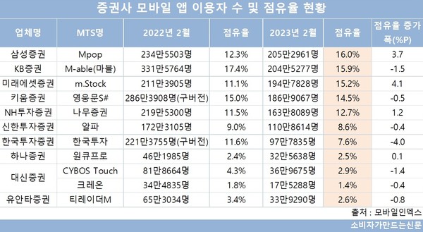 전년 동기 대비 점유율은 1.5%포인트 소폭 하락했으나 이용자 수는 204만5277명으로 삼성증권과 함께 유일하게 200만을 넘었다.