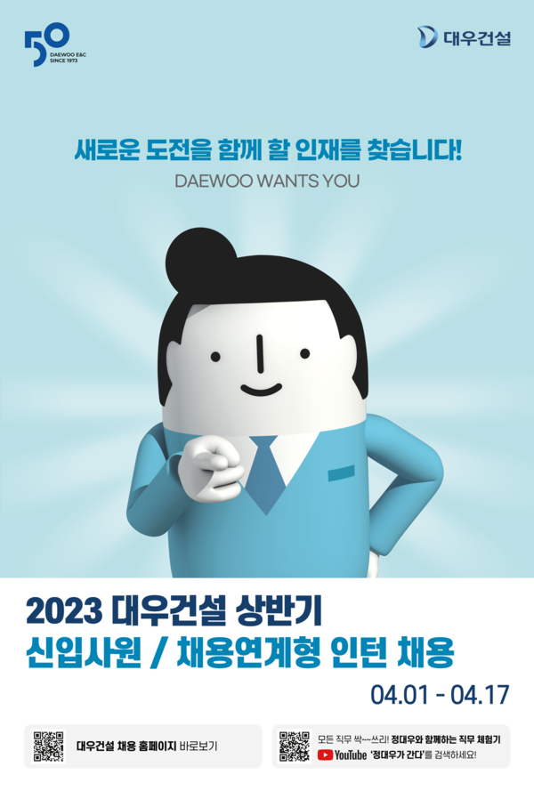 대우건설 관계자는 “대우건설은 국내 SOC 사업 확대 및 해외사업 수주로 균형잡힌 사업 포트폴리오를 구축하고 있으며, 올해는 이와 맞물려 토목‧플랜트 분야 엔지니어들을 주로 선발할 계획”이라며 “회사의 핵심가치인 도전과 열정, 자율과 책임, 신뢰와 협력에 부합하는 미래 건설인재들이 많이 지원하길 희망한다”고 밝혔다.