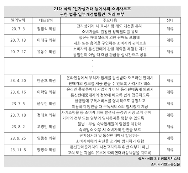 16일 국회 의안정보시스템에 따르면 2020년 5월부터 올해 5월까지 21대 국회에서 발의된 유통 관련 소비자 보호 법안 중 ‘전자상거래 등에서의 소비자보호에 관한 법률 일부개정법률안’(이하 전상법 개정안)이 42건으로 가장 많았다. 이 중 단 9건만 처리됐으며 나머지 33건 대부분 수년째 소관 상임위 심사조차 통과하지 못한 상태다.