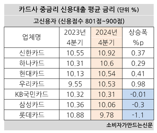 금리가 가장 높은 곳은 10.92%를 기록한 신한카드였고 금리 상승폭이 가장 큰 곳은 0.98%포인트 오른 우리카드였다.
