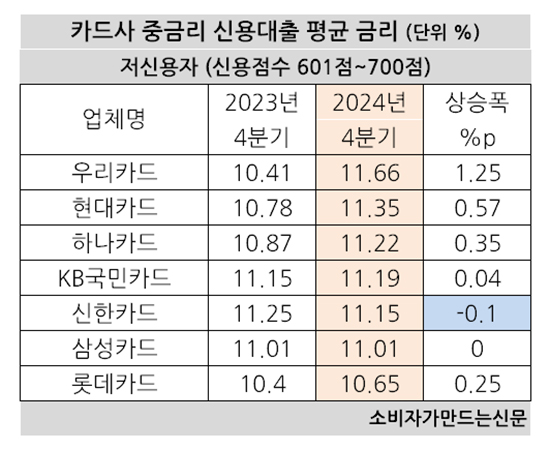 저신용자 중금리 대출 금리가 가장 높은 곳은 우리카드였다. 우리카드의 지난해 4분기 평균금리는 11.66%에 달했는데 전년 대비 상승폭 역시 1.25%포인트로 가장 높았다.