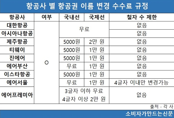 대한항공과 아시아나항공은 수수료와 철자 수 제한 없이 항공권 이름 변경이 가능하다. 제주항공, 티웨이, 진에어, 에어부산, 이스타항공 등은 국내선과 국제선을 구분해 수수료를 적용하고 있다. 에어서울만 변경 가능한 철자 수에 제한을 두고 있다.