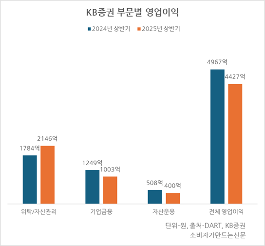 올해 상반기 KB증권의 영업이익은 4427억 원으로 작년 상반기 4967억 원 대비 10.9% 감소했다.