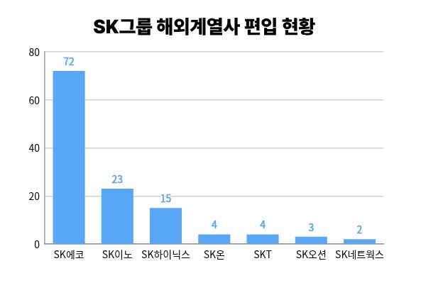 계열사 별로 살펴보면 SPC를 제외하고 5년여간 편입된 해외 계열사는 SK에코플랜트가 72개로 가장 많다. SK이노베이션 23개, SK하이닉스 15개 등이다.