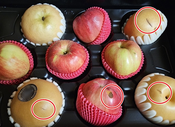 사과·배 혼합 선물세트로 이 씨가 배송받은 상자를 열자 과일들이 뒤집혀 있어 바로 돌리니 멍들고 패인 부분이 한 눈에 보였다. 판매처에 전액 환불 신청했지만 세 번이나 거절당했다. 판매자는 환불 시 구매 금액의 10%만 돌려 줄 수 있다는 말뿐이었다.