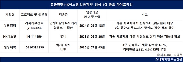 14일 업계에 따르면 유한양행은 개발 중인 알레르기 치료제 레시게르셉트(개발 코드명 YH35324), HK이노엔은 변비 치료제 IN-114199, 일동제약은 경구용 비만 치료제 ID110521156에 대해 임상 2상 진행 전 기술수출을 추진하고 있다.