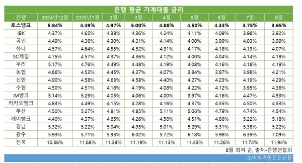 지난달 30일 은행연합회에 공시된 16개 시중은행의 8월 가계대출 평균 금리(신규취급액 기준)를 살펴본 결과 토스뱅크가 3.65%로 가장 낮았다.