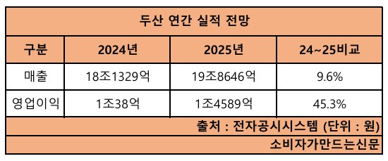 17일 금융정보업체 에프앤가이드에 따르면 (주)두산은 올해 매출 19조8646억 원, 영업이익 1조4589억 원의 실적을 기록할 것으로 전망된다. 전망치가 실현되면 전년 대비 매출은 9.6%, 영업이익은 45.3% 증가한다.