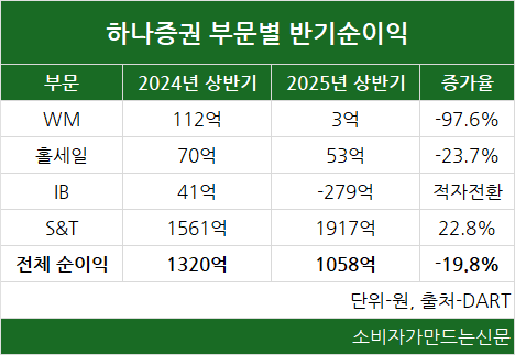 IB부문은 2024년 상반기 순이익이 41억 원이었으나 올해 상반기는 279억 원 순손실을 기록했다. 구조화 딜 유치 및 부동산 투자 수익 증가로 수수료 이익은 늘었으나 환율하락에 따른 외화평가손 및 보유주식 평가손으로 인해 투자이익이 감소했다는 것이 하나증권 측의 설명이다.