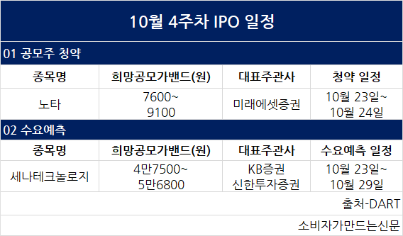 웨어러블 스마트기기 제조업체 세나테크놀로지는 10월 23일부터 29일까지 수요예측을 실시한다. 희망공모가는 4만7500~5만6800원으로 31일 공모가액을 확정한 후 11월 4일과 5일 공모주 청약을 진행할 예정이다. 공동대표주관사는 KB증권과 신한투자증권이다.