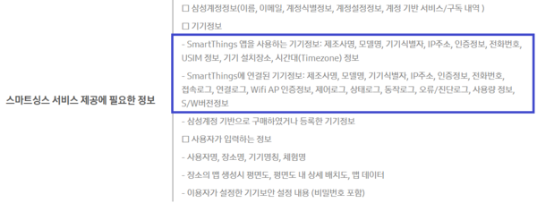 삼성전자 역시 스마트홈 구현을 위해 자사 앱인 스마트싱스를 통해 위치정보를 비롯해 IP주소, IMEI, MAC주소, 시간대, OS버전 등을 수집하고 있다.