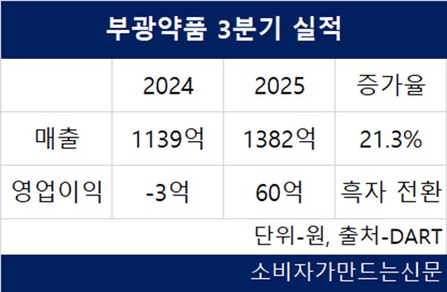 발표에 따르면 부광약품의 올 3분기 누적 매출은 1382억 원으로 전년 동기 대비 21.3% 증가했다. 영업이익은 60억 원으로 지난해 같은 기간 3억 원의 적자 대비 흑자 전환했다. 5개 분기 연속 흑자를 이어가고 있다.