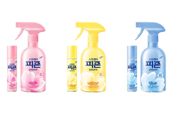 스프레이피죤은 △핑크로즈 △옐로미모사 △블루비앙카 등 3가지 향으로, 용량은 120mL, 430mL 두 가지 구성돼 있다.