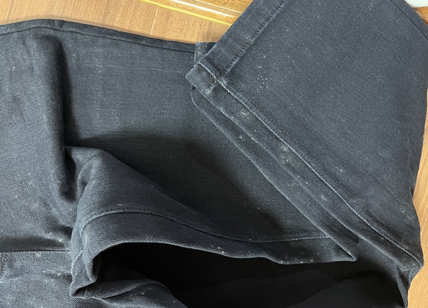 김 씨는 제품 수령 직후 포장을 열자 곰팡이 냄새와 함께 육안으로 확인 가능한 오염이 발견됐다고 주장했다. 검정 바지 군데군데 흰가루가 흩뿌려진 듯 곰팡이가 피어 있었다.