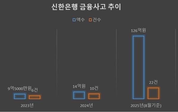 핵심 자회사인 신한은행은 금융사고 금액이 2023년 연간 9억5300만 원 수준이었으나 이듬해 14억 원으로 늘었고 올해는 8월까지 집계된 금액만 126억 원을 넘어섰다. 사고건수 역시 역시 같은 기간 연간 6건에서 22건으로 3배 이상 급증했다. 5대 시중은행 중에서는 금액 기준으로 가장 적었지만 건수 기준으로는 가장 많았다.