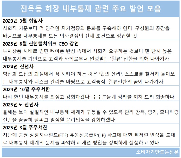진 회장은 취임 일성부터 최근까지 내부통제 강화를 끊임없이 강조했다.