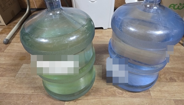 처음에는 알지 못했으나 배달받고 15일이 지났을 무렵 생수통이 초록색으로 보였다. 정상적인 생수통과 비교하니 색깔 차이가 확연했다.