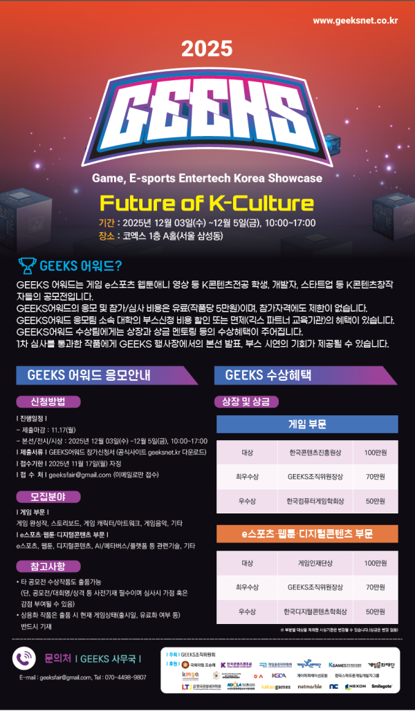 긱스어워드는 AI와 콘텐츠가 융합된 게임, e스포츠, 웹툰, 캐릭터, 애니메이션, 영상 등의 출품작들이 대거 선보일 예정이다. 현업전문가 및 대학교수들의 심사 및 현장발표를 거쳐 한국콘텐츠진흥원장상(예정) 게임인재단상, 게임문화재단상 등이 수여되며 오는 17일까지 신청가능하다.