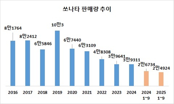 9세대 쏘타나 출시에 관심이 모아지는 것은 국내 최장수 브랜드이자 글로벌 누적 판매 1000만대를 눈앞에 두고 있지만 6년째 판매량이 감소하고 있기 때문이다.