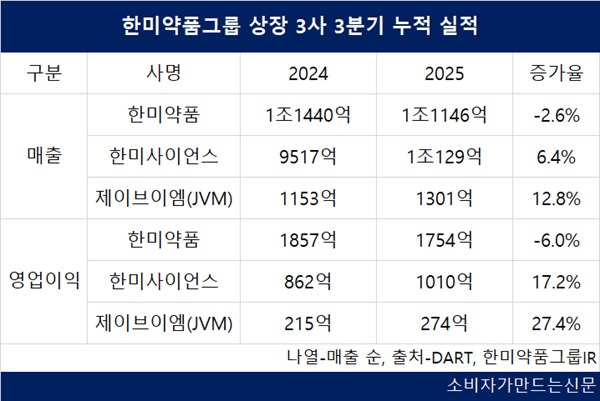 31일 전자공시시스템에 따르면 한미사이언스의 올해 3분기 누적 매출은 1조129억 원으로 전년 동기 대비 6.4% 증가했다. 영업이익은 1010억 원으로 17.2% 늘었다.