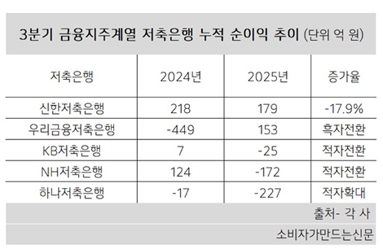 반면 KB저축은행, 올해 3분기 누적 기준 순이익이 -25억 원으로 전년 동기 7억 원 대비 적자 전환됐고 NH저축은행 역시 같은 기간 순이익이 124억 원 흑자에서 172억 원 적자로 적자전환됐다.
