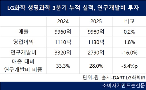 4일 전자공시시스템에 따르면 LG화학 생명과학 부문의 3분기 누적 연구개발비는 2790억 원으로 전년 동기 대비 16% 감소했다.