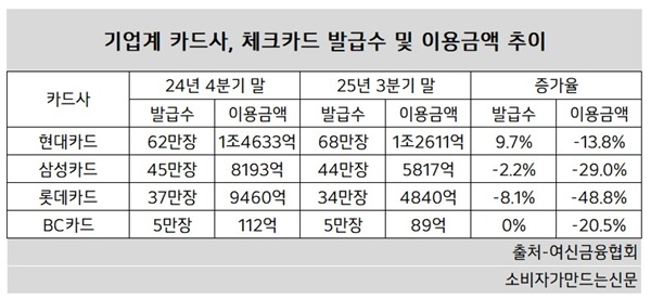 4일 여신금융협회에 따르면 올해 3분기 말 체크카드 발급 수가 전년 말 대비 증가한 곳은 현대카드가 유일했다. 롯데카드와 삼성카드는 감소했고 BC카드(대표 최원석)는 변동이 없었다.