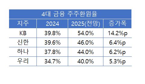 연말 예상치 기준으로 4대 금융지주 중에서 유일하게 50%를 넘는 것으로 경쟁사와의 총주주환원율 격차도 8~14%포인트에 달할 것으로 예측된다.