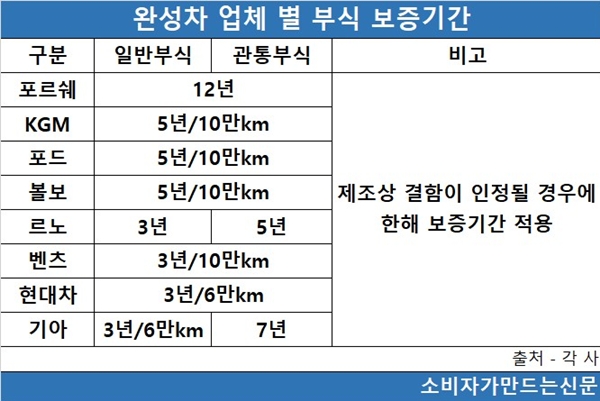 소비자분쟁해결기준에는 △후드 △도어 △필러 △휀더 △테일게이트 등에 부식이 생긴 경우 품질보증기간을 5년으로 두고 있지만 외판 '관통 부식'으로 제한한다. 가령 표면이 부식된 경우 구멍이 날 정도까지 진행돼야 보증 적용이 가능해 외판이나 부품 표면에서 퍼지는 '일반 부식'의 경우는 사실상 구제 받기 어렵다.