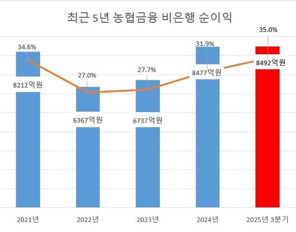 다만 NH투자증권은 3분기 누적순이익이 지분율 감안후 기준 4217억 원으로 역대 최대치를 달성하며 농협금융의 전체 비은행 순이익은 3분기 기준 8492억 원에 달했다. 비은행 순이익 비중도 지난해 31.9%에서 올해 3분기 기준 35%로 3.1%포인트 상승했다.