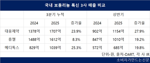 12일 전자공시시스템에 따르면 톡신 빅3 중 3분기 누적 톡신 매출이 가장 큰 곳은 대웅제약이다. 1707억 원으로 전년 동기 대비 23.9% 늘었다.