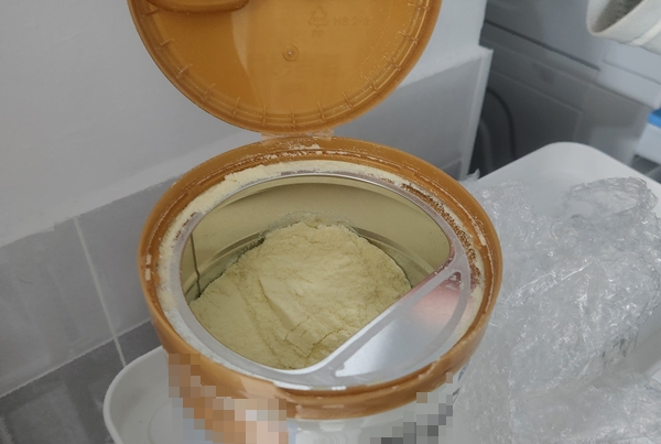 분유통을 밀봉하는 알루미늄 포장이 이미 제거된 상태였고 내용물도 줄어 있었다.