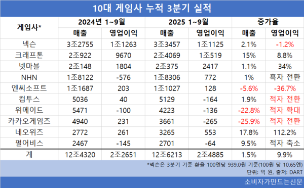 12일 전자공시스템에 따르면 10대 게임사의 3분기 누적 매출은 12조6213억 원, 영업이익은 2조4885억 원을 기록했다. 전년 동기 대비 매출은 1.5%, 영업이익은 9.9% 증가했다.