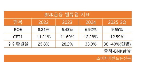 ‘2027 밸류업’ 계획의 핵심 지표는 개선세가 뚜렷하다. ROE는 2022년 8.21%에서 2023년 6.43%로 하락했으나 2024년 6.92%, 올해 3분기 누적 기준 9.65%까지 올랐다. CET1은 2022년 11.21%에서 올해 3분기 12.59%까지 상승해 2027년 목표치(12.5%)를 조기 달성했다.