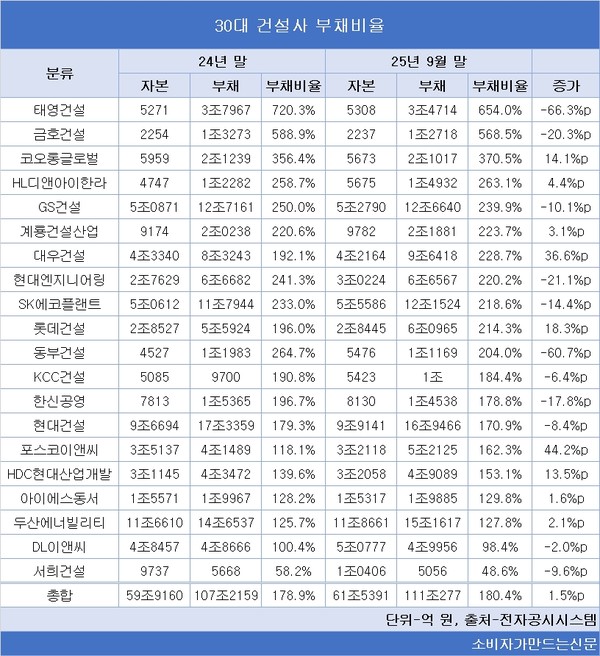 태영건설은 부채비율이 654%로 가장 높다. 다만 2023년 부동산 프로젝트 파이낸싱(PF) 문제로 자본잠식에 빠진 것을 고려하면 재무개선은 조금씩 이뤄지고 있는 모습이다. 올해 들어서도 부채비율은 66%포인트 낮아졌다. 30대 건설사 중 감소폭이 가장 크다. 동부건설(대표 윤진오)도 60%포인트 떨어졌다.