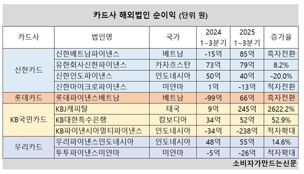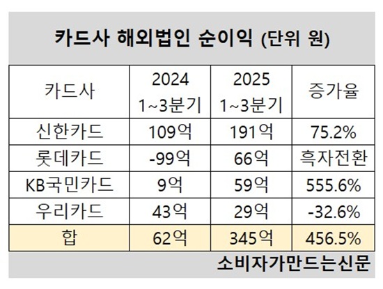 19일 해외법인을 운영 중인 신한카드, 롯데카드, KB국민카드, 우리카드 국내 카드사 4곳의 올해 3분기 누적 당기순이익 합산 수치는 345억 원으로 전년 동기 62억 원 대비 456.5%나 급증했다.