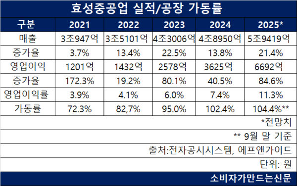 효성중공업의 실적 갱신은 올해가 처음이 아니다. 2023년과 2024년도 매출과 영업이익 모두 역대 최대 기록을 썼다. 올해까지 이어지면 3년 연속이 된다.
