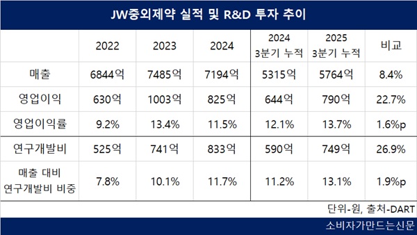 신 대표의 3번째 임기 중 JW중외제약은 영업이익 규모가 예년에 비해 두 배 이상 커졌고 매출 대비 연구개발 비중도 3년째 10% 이상을 기록했다.