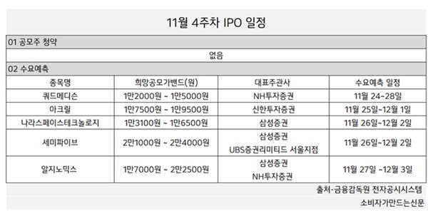 의료용 마이크로니들(미세바늘) 전문기업 쿼드메디슨은 11월 24일부터 28일까지 수요예측을 진행한다. 희망공모가는 1만2000원~1만5000원이며 12월 1일 공모가액이 확정될 예정이다. 대표주관사는 NH투자증권이다.